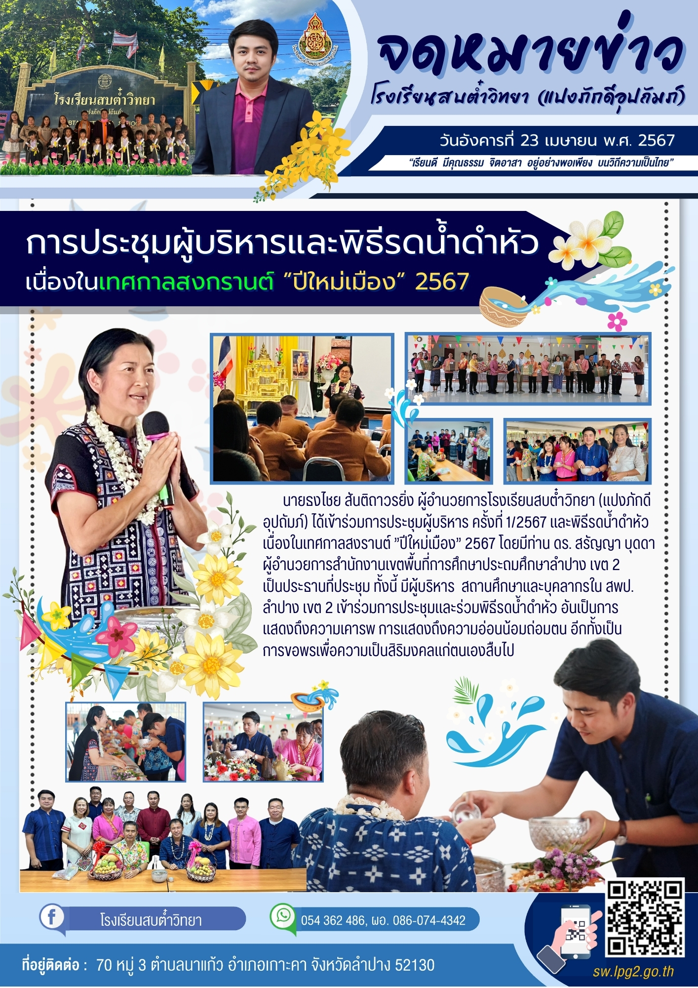นายธงไชย สันติถาวรยิ่ง ผู้อำนวยการโรงเรียนสบต๋ำวิทยา (แปงภักดีอุปถัมภ์) ได้เข้าร่วมการประชุมผู้บริหาร ครั้งที่ 1/2567 และพิธีรดน้ำดำหัว เนื่องในเทศกาลสงรานต์ ”ปีใหม่เมือง” 2567 โดยมีท่าน ดร. สรัญญา บุดดา ผู้อำนวยการสำนักงานเขตพื้นที่การศึกษาประถมศึกษาลำปาง เขต 2 เป็นประธานที่ประชุม ทั้งนี้ มีผู้บริหาร สถานศึกษาและบุคลากรใน สพป. ลำปาง เขต 2 เข้าร่วมการประชุมและร่วมพิธีรดน้ำดำหัว อันเป็นการแสดงถึงความเคารพ การแสดงถึงความอ่อนน้อมถ่อมตน อีกทั้งเป็นการขอพรเพื่อความเป็นสิริมงคลแก่ตนเองสืบไป