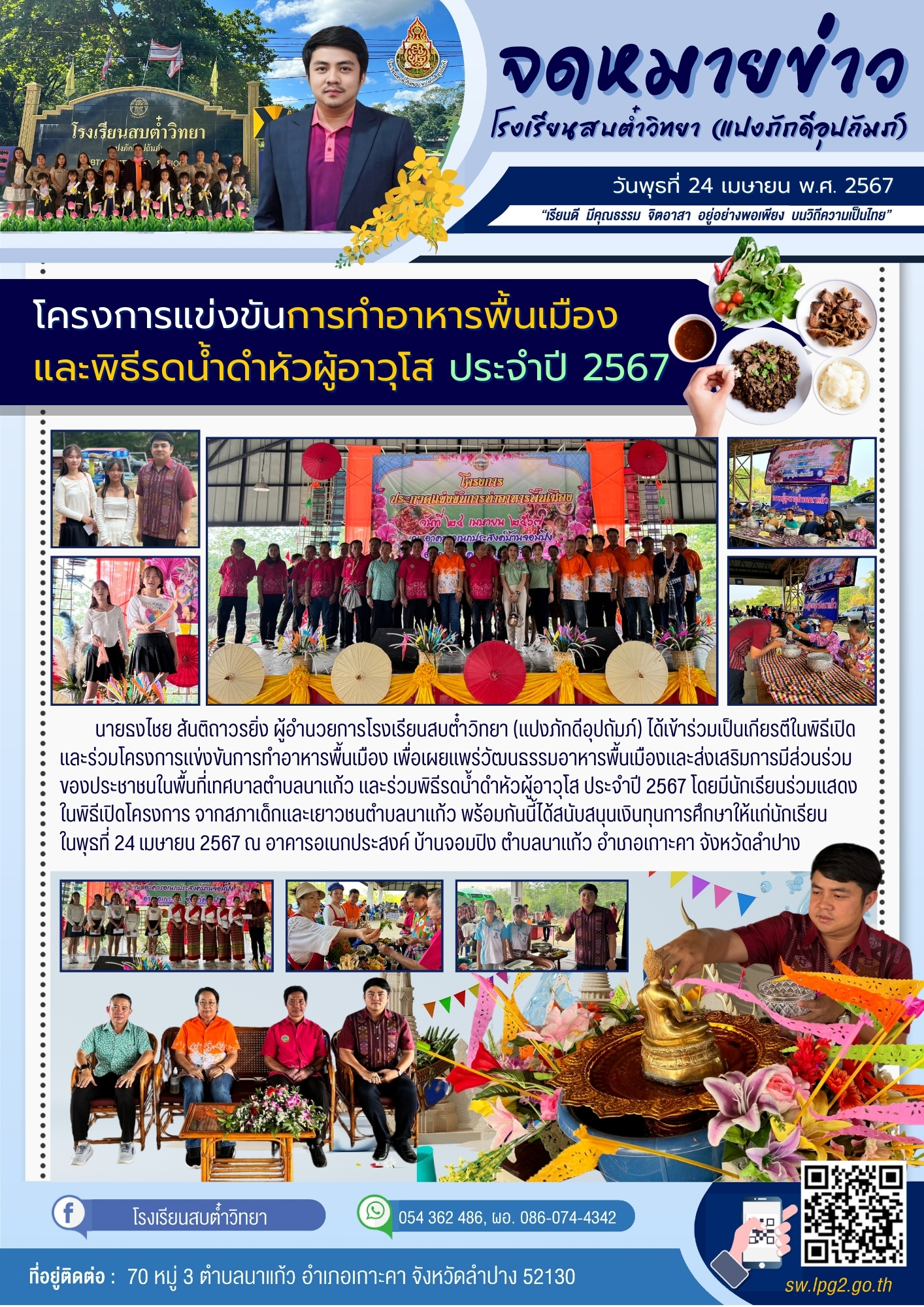 นายธงไชย สันติถาวรยิ่ง ผู้อำนวยการโรงเรียนสบต๋ำวิทยา (แปงภักดีอุปถัมภ์) ได้เข้าร่วมเป็นเกียรตีในพิธีเปิดและร่วมโครงการแข่งขันการทำอาหารพื้นเมือง เพื่อเผยแพร่วัฒนธรรมอาหารพื้นเมืองและส่งเสริมการมีส่วนร่วมของประชาชนในพื้นที่เทศบาลตำบลนาแก้ว และร่วมพิธีรดน้ำดำหัวผู้อาวุโส ประจำปี 2567 โดยมีนักเรียนร่วมแสดงในพิธีเปิดโครงการ จากสภาเด็กและเยาวชนตำบลนาแก้ว พร้อมกันนี้ได้สนับสนุนเงินทุนการศึกษาให้แก่นักเรียน ในพุธที่ 24 เมษายน 2567 ณ อาคารอเนกประสงค์ บ้านจอมปิง ตำบลนาแก้ว อำเภอเกาะคา จังหวัดลำปาง