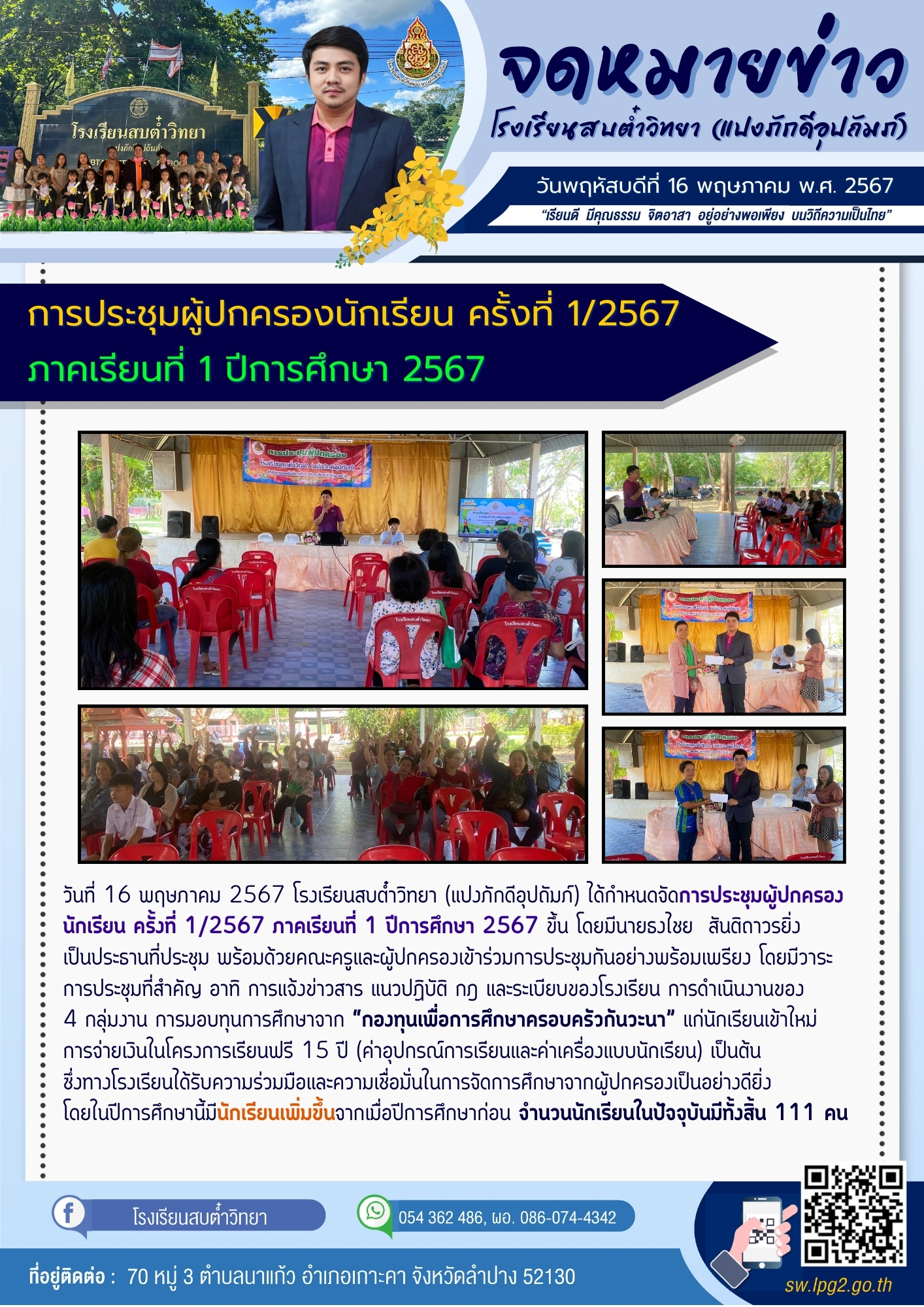 วันที่ 16 พฤษภาคม 2567 โรงเรียนสบต๋ำวิทยา (แปงภักดีอุปถัมภ์) ได้กำหนดจัดการประชุมผู้ปกครองนักเรียน ครั้งที่ 1/2567 ภาคเรียนที่ 1 ปีการศึกษา 2567 ขึ้น โดยมีนายธงไชย สันติถาวรยิ่ง เป็นประธานที่ประชุม พร้อมด้วยคณะครูและผู้ปกครองเข้าร่วมการประชุมกันอย่างพร้อมเพรียง โดยมีวาระการประชุมที่สำคัญ อาทิ การแจ้งข่าวสาร แนวปฏิบัติ กฎ และระเบียบของโรงเรียน การดำเนินงานของ 4 กลุ่มงาน การมอบทุนการศึกษาจาก “กองทุนเพื่อการศึกษาครอบครัวกันวะนา” แก่นักเรียนเข้าใหม่การจ่ายเงินในโครงการเรียนฟรี 15 ปี (ค่าอุปกรณ์การเรียนและค่าเครื่องแบบนักเรียน) เป็นต้น ซึ่งทางโรงเรียนได้รับความร่วมมือและความเชื่อมั่นในการจัดการศึกษาจากผู้ปกครองเป็นอย่างดียิ่ง โดยในปีการศึกษานี้มีนักเรียนเพิ่มขึ้นจากเมื่อปีการศึกษาก่อน จำนวนนักเรียนในปัจจุบันมีทั้งสิ้น 111 คน