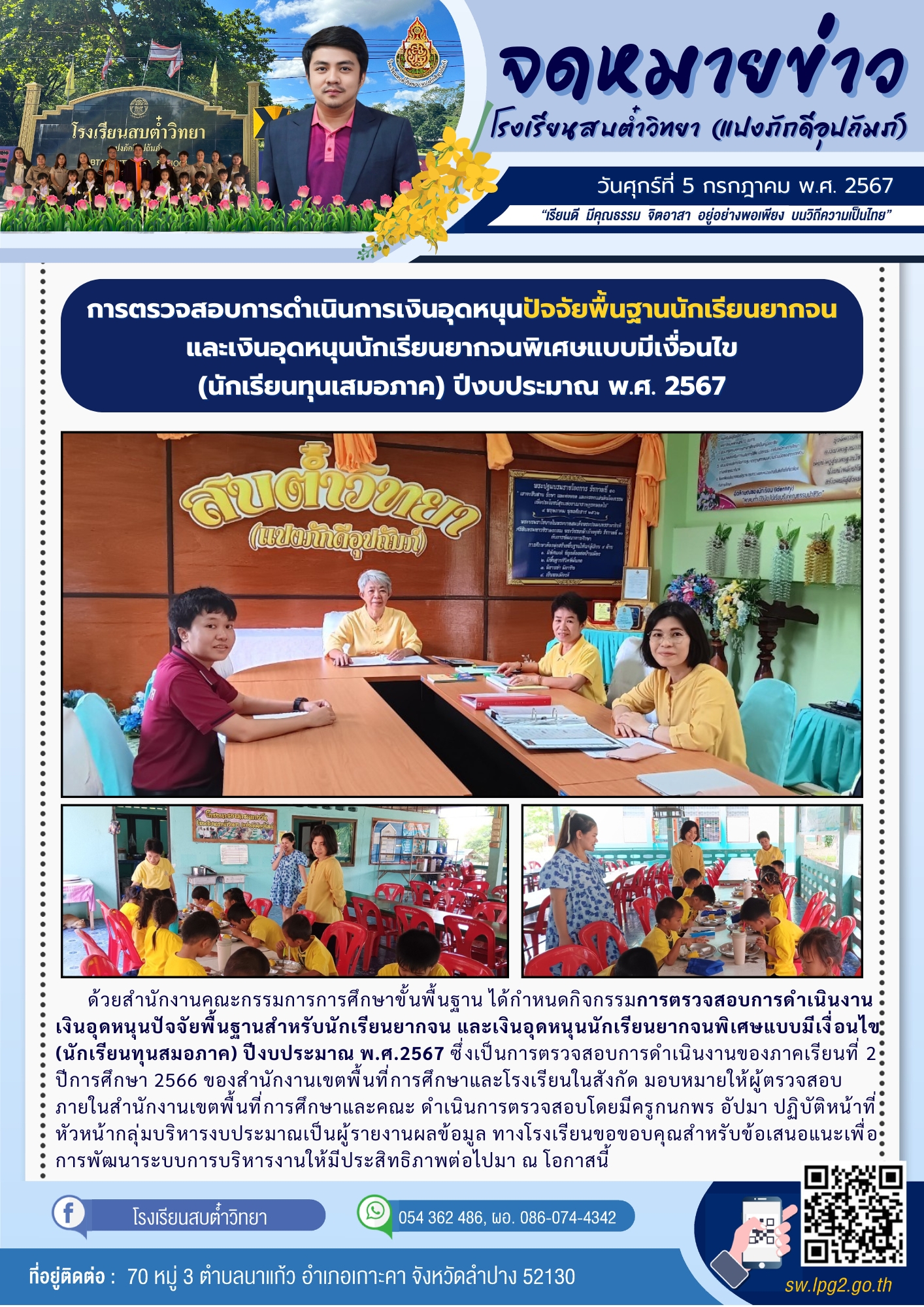 ด้วยสำนักงานคณะกรรมการการศึกษาขั้นพื้นฐาน ได้กำหนดกิจกรรมการตรวจสอบการดำเนินงานเงินอุดหนุนปัจจัยพื้นฐานสำหรับนักเรียนยากจน และเงินอุดหนุนนักเรียนยากจนพิเศษแบบมีเงื่อนไข (นักเรียนทุนสมอภาค) ปีงบประมาณ พ.ศ.2567 ซึ่งเป็นการตรวจสอบการดำเนินงานของภาคเรียนที่ 2 ปีการศึกษา 2566 ของสำนักงานเขตพื้นที่การศึกษาและโรงเรียนในสังกัด มอบหมายให้ผู้ตรวจสอบภายในสำนักงานเขตพื้นที่การศึกษาและคณะ ดำเนินการตรวจสอบโดยมีครูกนกพร อัปมา ปฏิบัติหน้าที่หัวหน้ากลุ่มบริหารงบประมาณเป็นผู้รายงานผลข้อมูล ทางโรงเรียนขอขอบคุณสำหรับข้อเสนอแนะเพื่อการพัฒนาระบบการบริหารงานให้มีประสิทธิภาพต่อไปมา ณ โอกาสนี้