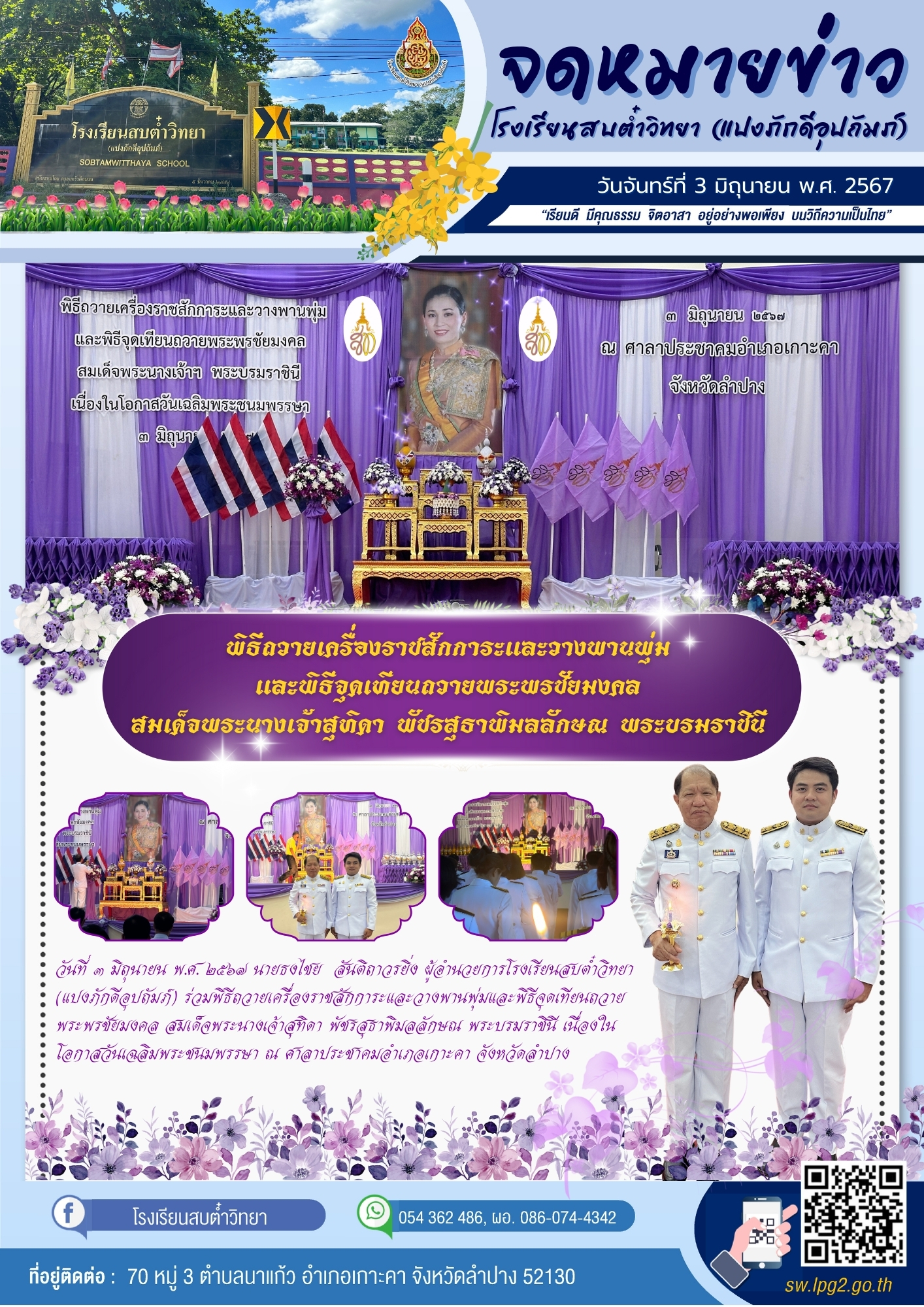 วันที่ 3 มิถุนายน พ.ศ. 2567 นายธงไชย สันติถาวรยิ่ง ผู้อำนวยการโรงเรียนสบต๋ำวิทยา (แปงภักดีอุปถัมภ์) ร่วมพิธีถวายเครื่องราชสักการะและวางพานพุ่มและพิธีจุดเทียนถวายพระพรชัยมงคล สมเด็จพระนางเจ้าสุทิดา พัชรสุธาพิมลลักษณ พระบรมราชินี เนื่องในโอกาสวันเฉลิมพระชนมพรรษา ณ ศาลาประชาคมอำเภอเกาะคา จังหวัดลำปาง