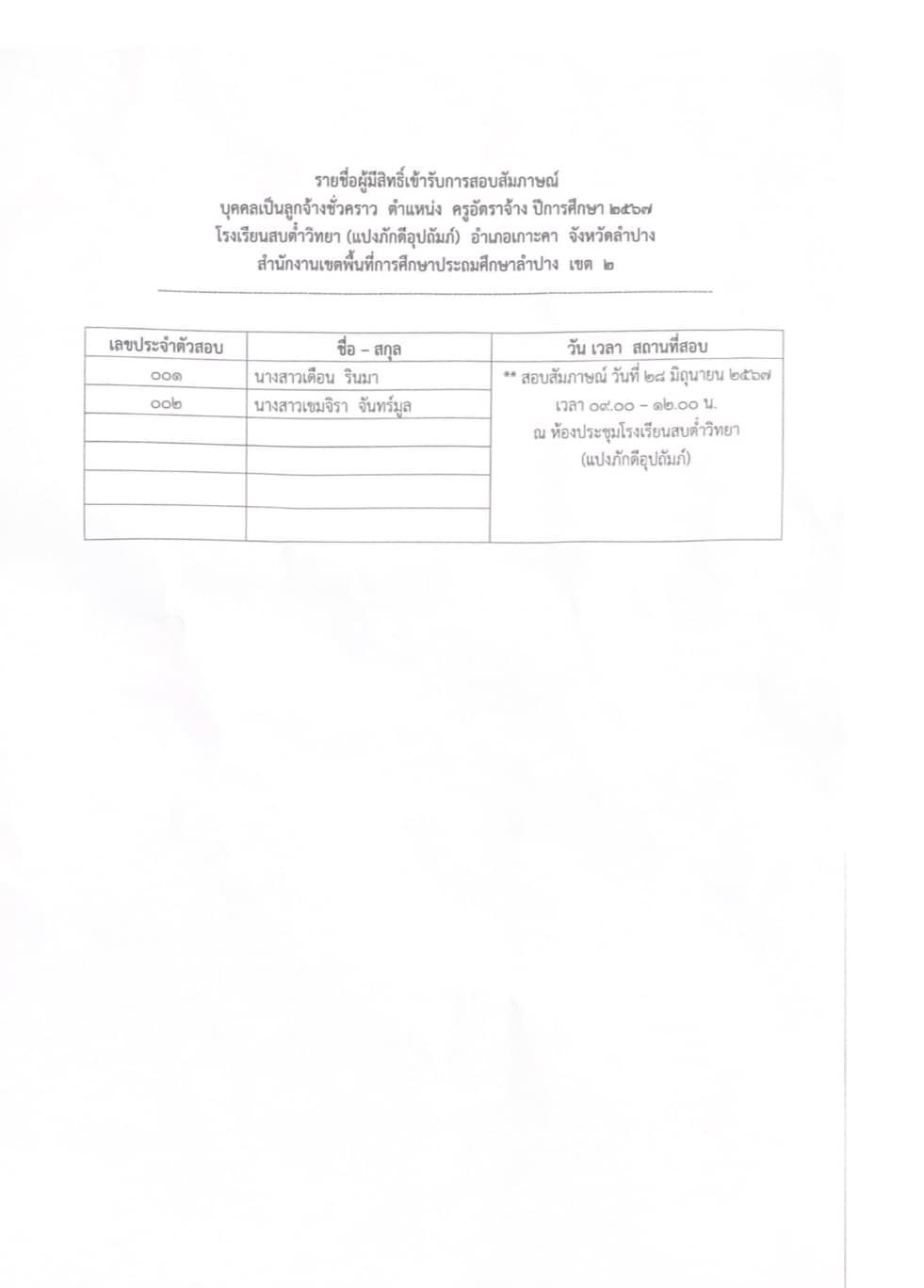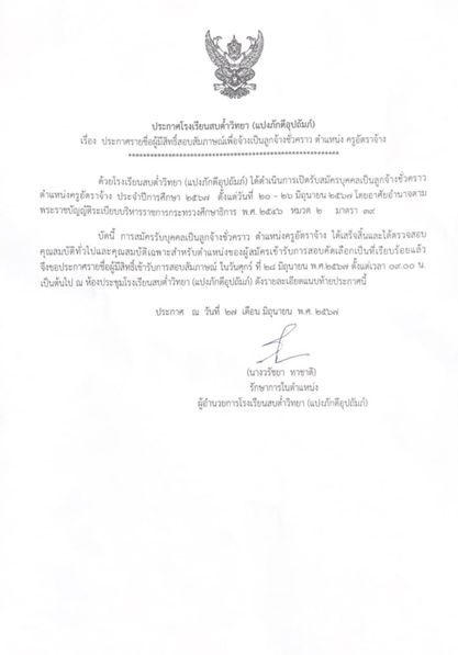 ประกาศรายชื่อผู้มีสิทธิ์เข้ารับการสอบสัมภาษณ์บุคคลเป็นลูกจ้างชั่วคราว ตำแหน่ง ครูอัตราจ้าง