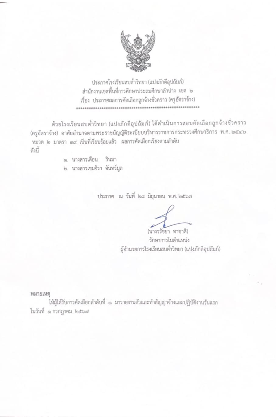 ประกาศโรงเรียนสบต๋ำวิทยา (แปงภักดีอุปถัมภ์) เรื่อง บัญชีรายชื่อผู้ผ่านการคัดเลือกบุคคลเป็นลูกจ้างชั่วคราว (ครูอัตราจ้าง)