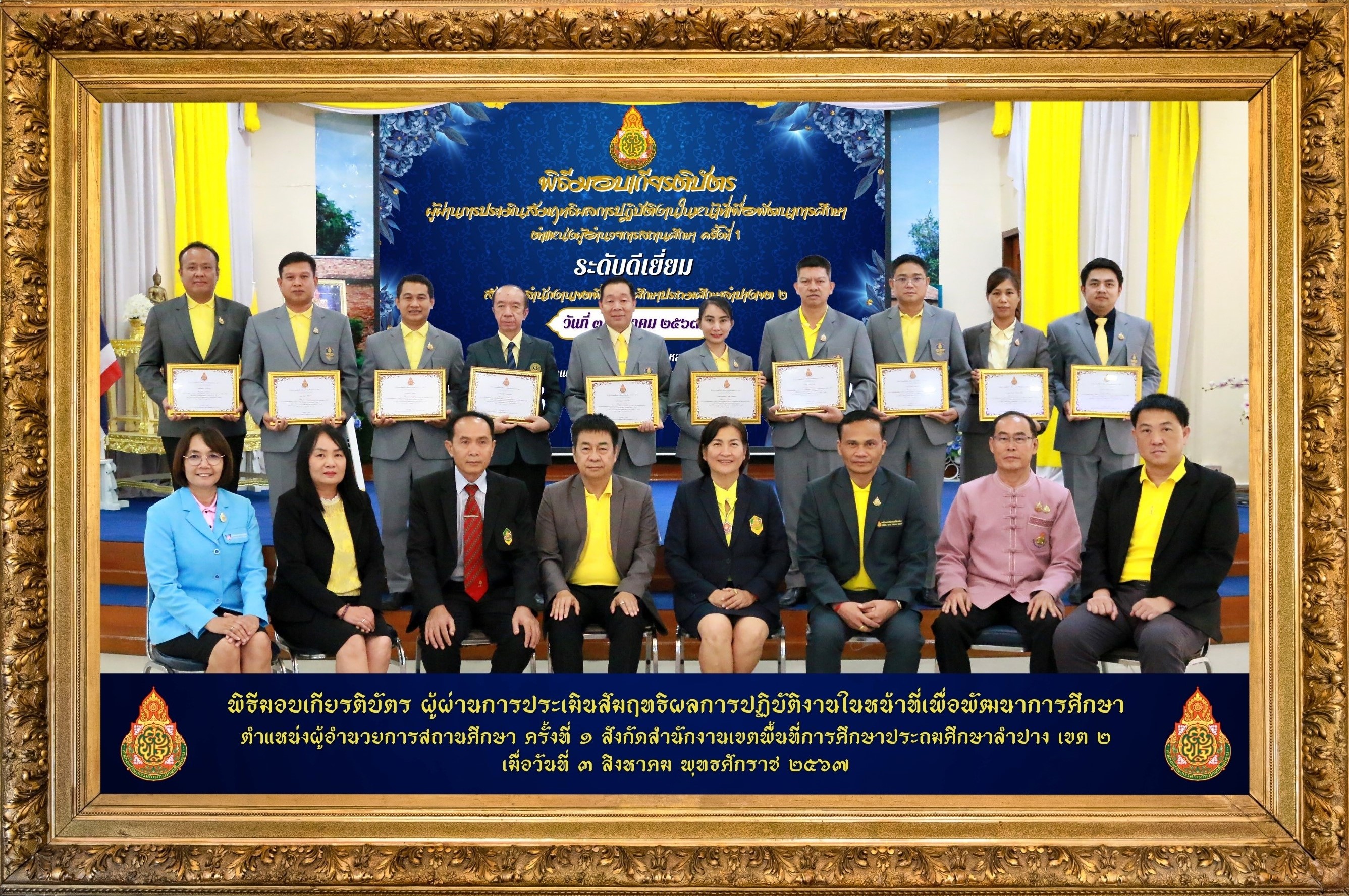 พิธีมอบเกียรติบัตร ผู้ผ่านการประเมินสัมฤทธิผลการปฏิบัติงานในหน้าที่เพื่อพัฒนาการศึกษาตำแหน่งผู้อำนวยการสถานศึกษา ครั้งที่ ๑ (ระดับดีเยี่ยม) สังกัดสำนักงานเขตพื้นที่การศึกษาประถมศึกษาลำปาง เขต ๒เมื่อวันที่ ๓ สิงหาคม พุทธศักราช ๒๕๖๗