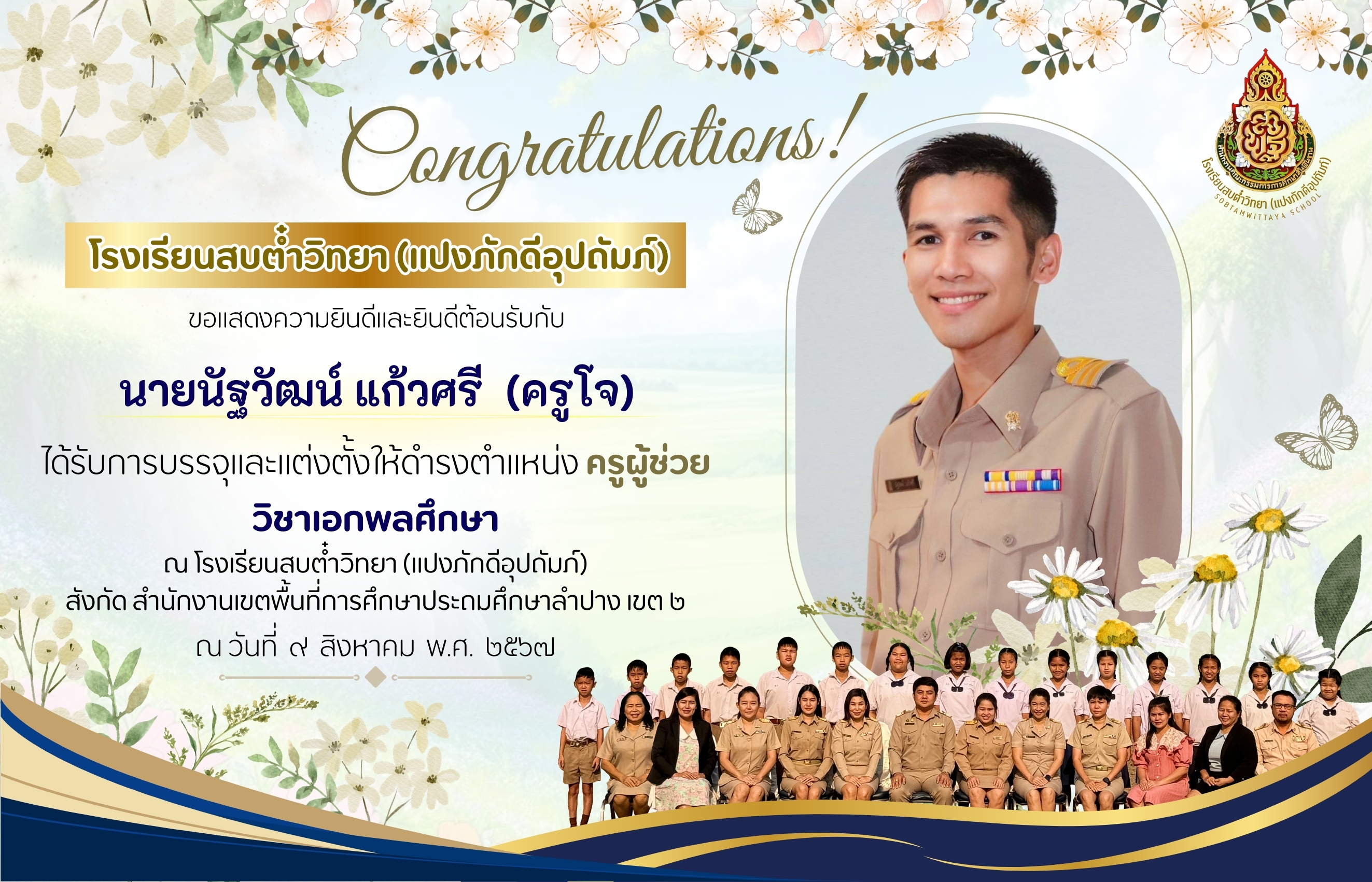 ยินดีต้อนรับ นายนัฐวัฒน์ แก้วศรี (ครูโจ) ในโอกาสได้รับการบรรจุและแต่งตั้งให้ดำรงตำแหน่ง ครูผู้ช่วย