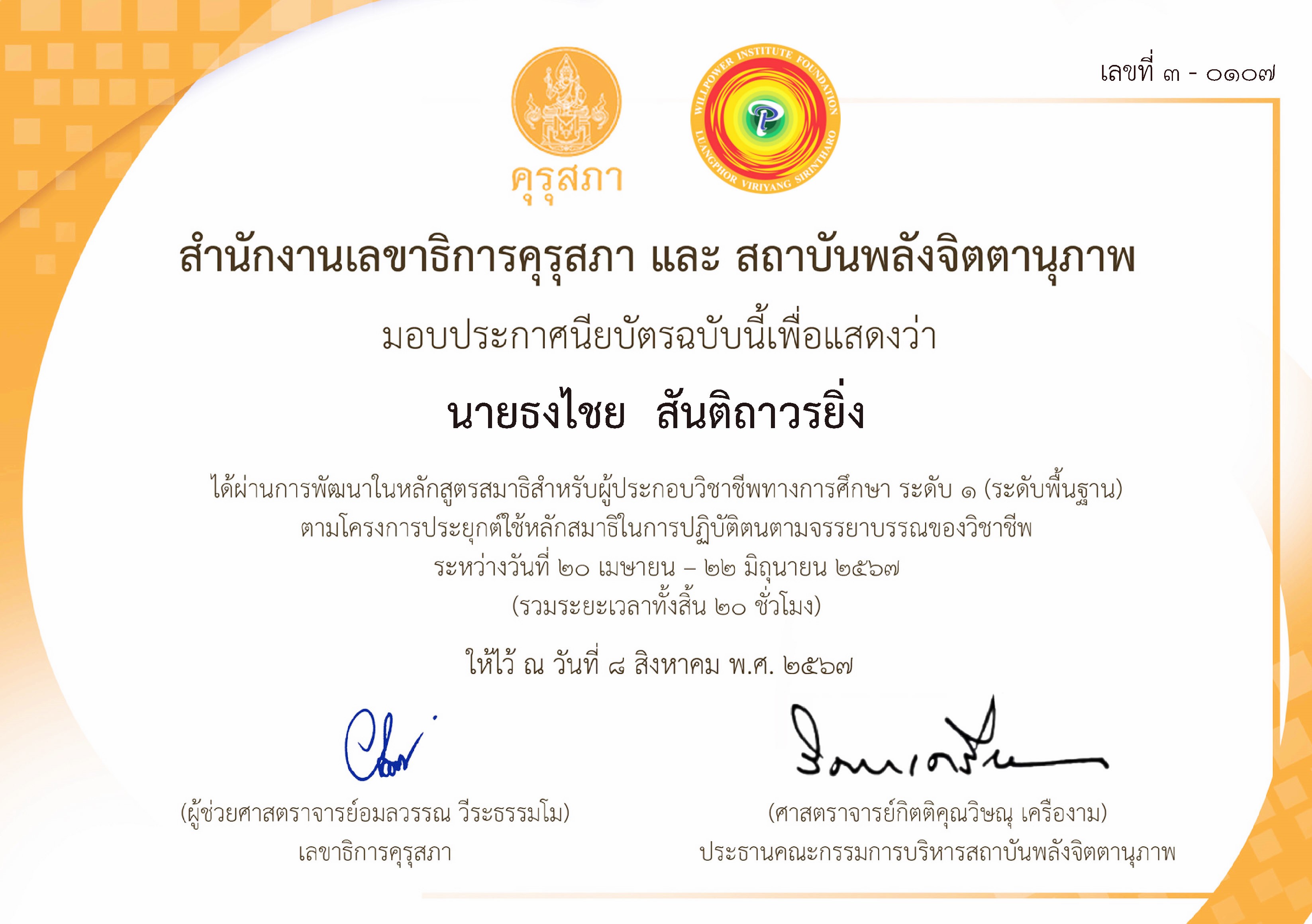 ผอ. ธงไชย สันติถาวรยิ่ง เข้ารับประกาศนียบัตรผ่านการพัฒนาในหลักสูตรสมาธิสำหรับผู้ประกอบวิชาชีพทางการศึกษา ระดับ 1 (ระดับพื้นฐาน) ตามโครงการประยุกต์ใช้หลักสมาธิในการปฏิบัติตนตามจรรยาบรรณของวิชาชีพ ระหว่างวันที่ 20 เมษายน - 22 มิถุนายน 2567 (รวมระยะเวลาทั้งสิ้น 20 ชั่วโมง) โดย สำนักงานเลขาธิการครุสภา และ สถาบันพลังจิตตานุภาพ ณ วันที่ 8 สิงหาคม พ.ศ. 2567