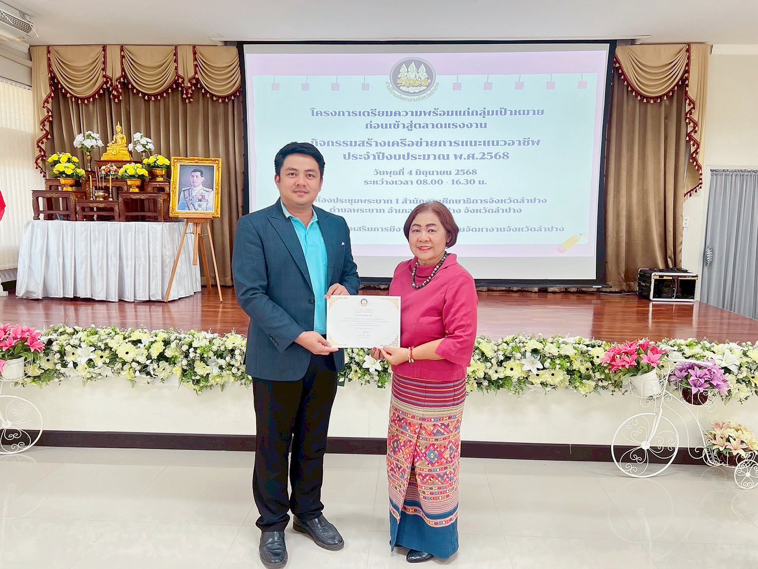 วันที่ 4 มิถุนายน 2568 นายธงไชย สันติถาวรยิ่ง ผู้อำนวยการโรงเรียนสบต๋ำวิทยา (แปงภักดีอุปถัมภ์) เข้าร่วมโครงการเตรียมความพร้อมแก่กลุ่มเป้าหมาย ก่อนเข้าสู่ตลาดแรงงาน กิจกรรมสร้างเครือข่ายการแนะแนวอาชีพ ประจำปีงบประมาณ พ.ศ.2568 ณ ศธจ.ลำปาง จัดโดยสำนักงานจัดหางานจังหวัดลำปาง