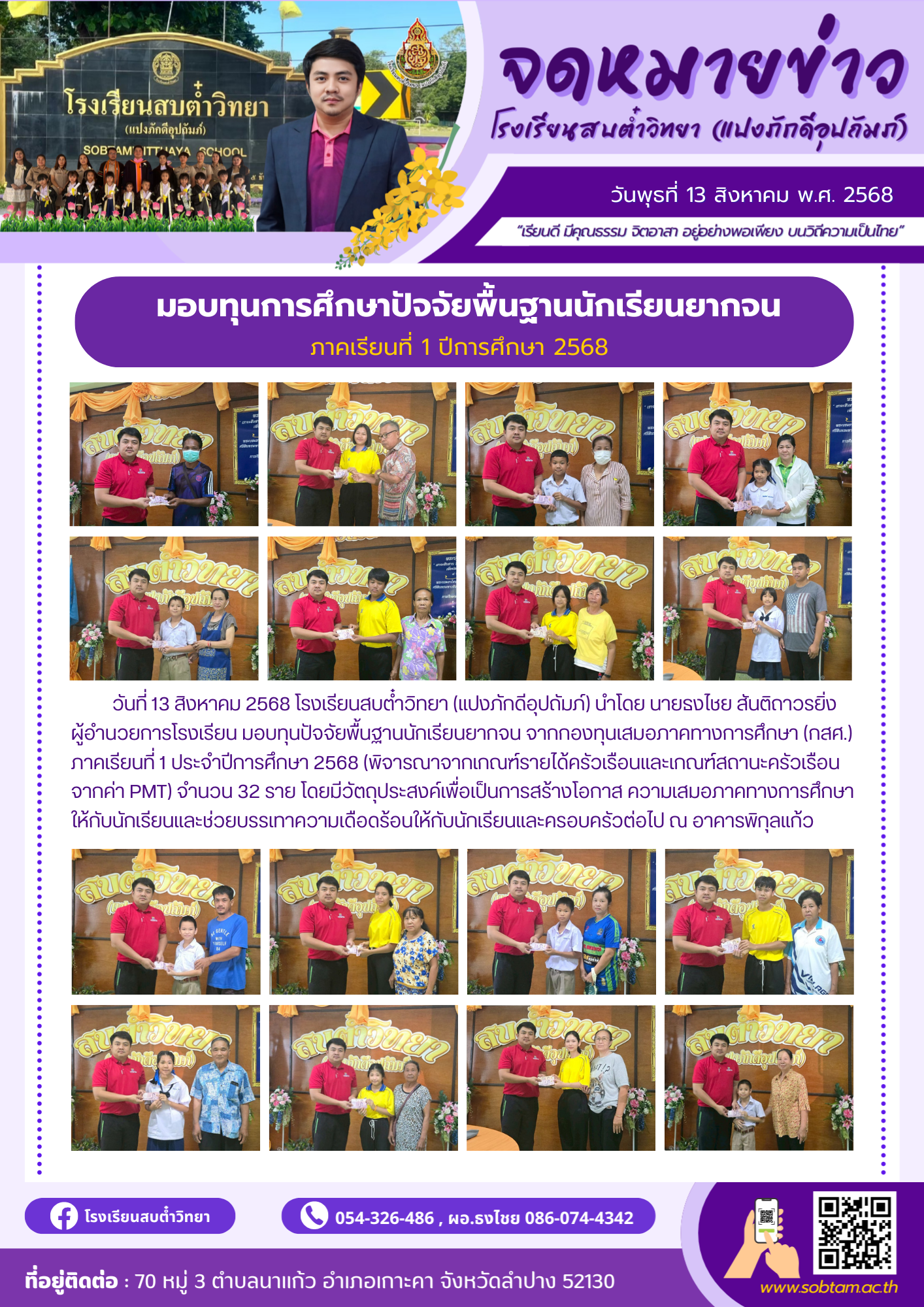 วันที่ 13 สิงหาคม 2568 โรงเรียนสบต๋ำวิทยา (แปงภักดีอุปถัมภ์) นำโดย นายธงไชย สันติถาวรยิ่ง ผู้อำนวยการโรงเรียน มอบทุนปัจจัยพื้นฐานนักเรียนยากจน จากกองทุนเสมอภาคทางการศึกษา (กสศ.) ภาคเรียนที่ 1 ประจำปีการศึกษา 2568 (พิจารณาจากเกณฑ์รายได้ครัวเรือนและเกณฑ์สถานะครัวเรือนจากค่า PMT) จำนวน 32 ราย โดยมีวัตถุประสงค์เพื่อเป็นการสร้างโอกาส ความเสมอภาคทางการศึกษาให้กับนักเรียนและช่วยบรรเทาความเดือดร้อนให้กับนักเรียนและครอบครัวต่อไป ณ ห้องประชุมอาคารพิกุลแก้ว